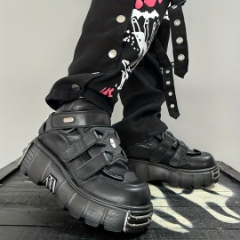 女性のブラックパンクスタイルフラットプラットフォームアンクルブーツ。ハイヒール、ラウンドトゥ、厚底、メタルデコレーションが特徴で、Y2Kゴシックルックやハロウィンスポーツに最適です。