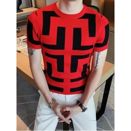軽量感 | メンズ スリムフィット 半袖 ニットセーター - カジュアル 幾何学模様 プルオーバー、夏用 レッド&ブラック ニットトップ、ラウンドネック、軽量&通気性生地、プルオーバートップ | 幾何学模様セーター | 快適な着心地