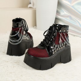 レトロパンクスタイルの女性用プラットフォームブーツ チェーンディテール付き - 音楽フェスティバル&ハロウィンパーティー用のおしゃれなスリップオンアンクルブーティー、快適なオールシーズンシューズ