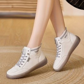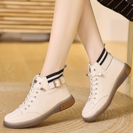 女性用の無地のカジュアルスニーカー、レースアップのバックルベルトと柔らかいソールのプラットフォームウォーキングシューズ、汎用性の高いハイカットシューズ